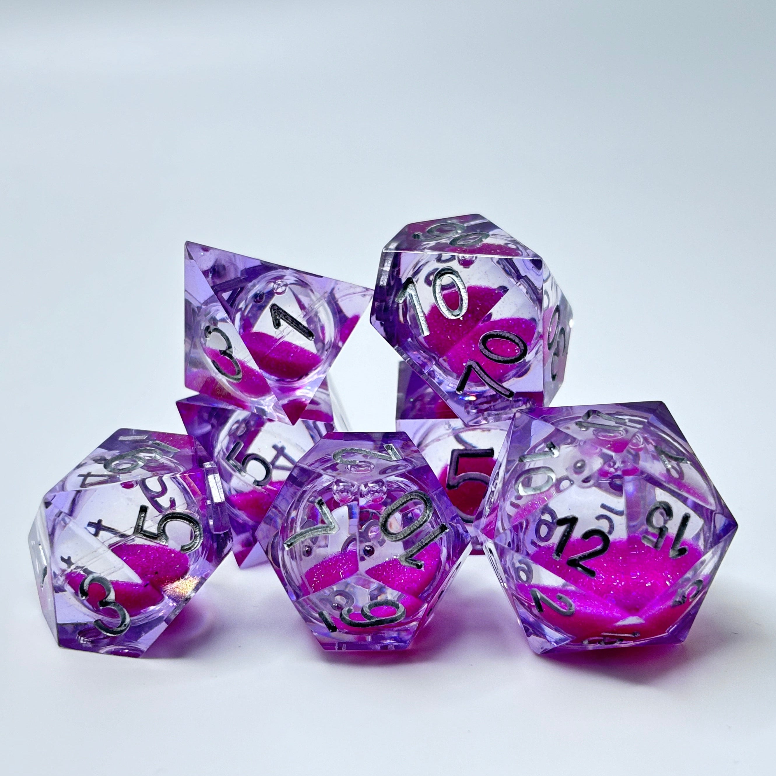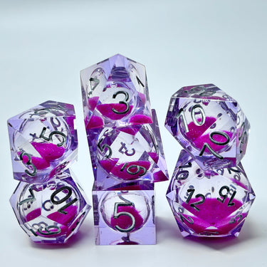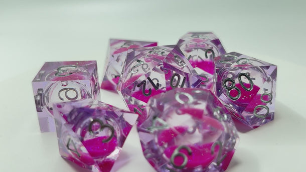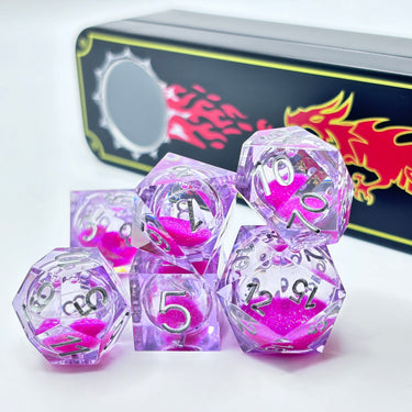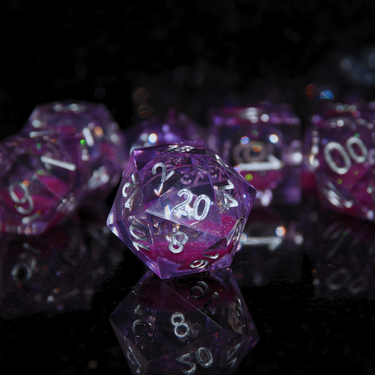 Enjoy a 7 piece hand made resin dice set cast with a liquid centre. Move the dice around and watch the centers swirl. These dice are beautiful to roll and well balanced for gameplay. Ideal for any table top RPG game.