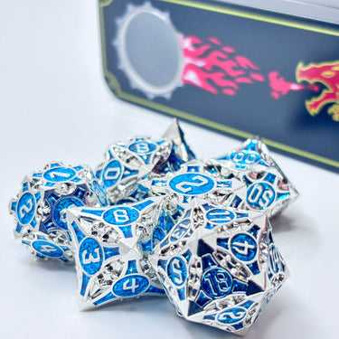 The set comes packaged in a collectable metal storage case that is lined with foam to keep your dice extra comfy.