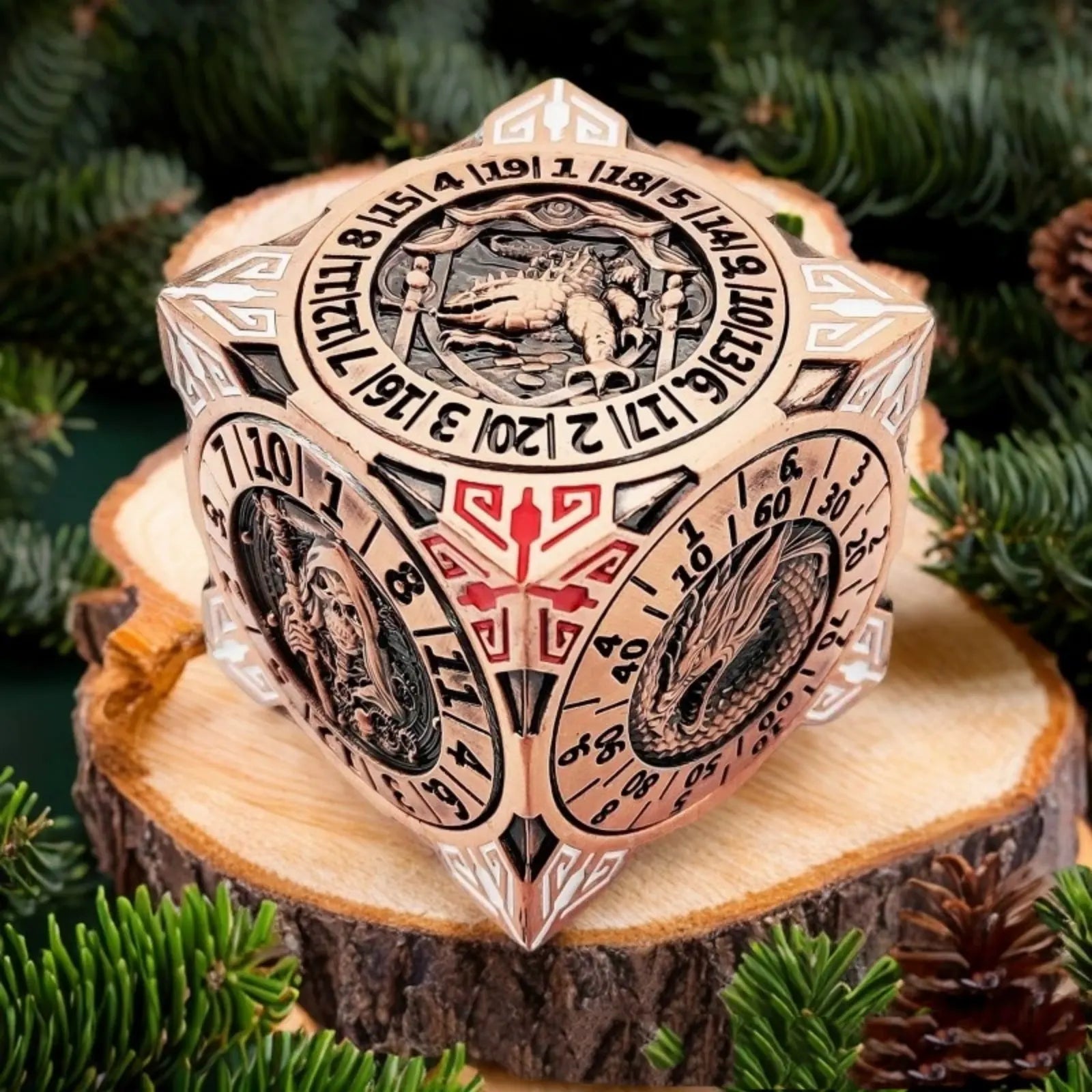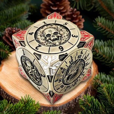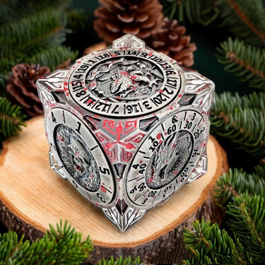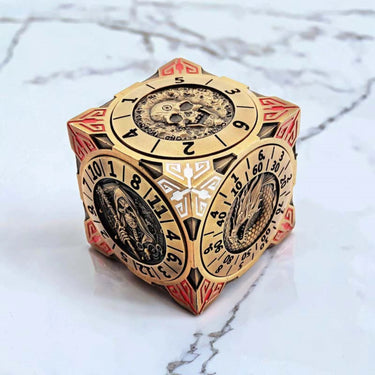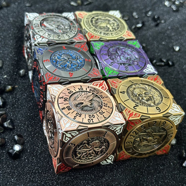 Hidden within its sleek cube design are seven precision-engineered spinners, each representing a different polyhedral die: d4, d6, d8, d10, d12, d20, and even a percentile die.